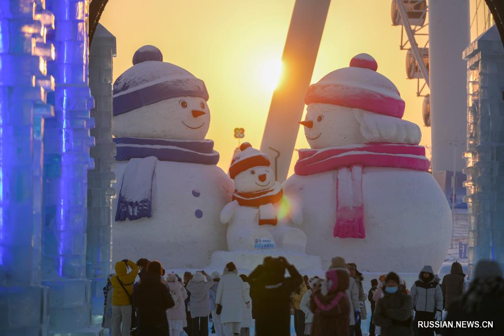 На закате туристы гуляют по парку "Большой мир льда и снега" в г. Харбин /адм. центр пров. Хэйлунцзян