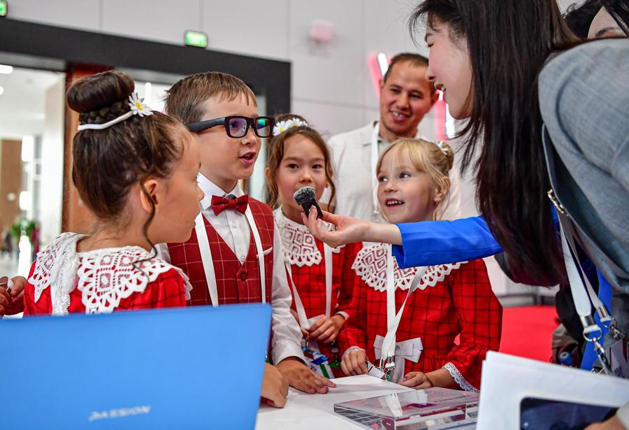 18 августа, Казань, Россия. На полях 3-го международного форума "Ростки: Россия и Китай -- взаимовыгодное сотрудничество" мальчик из России общается с китайскими гостями с помощью умных очков с искусственным интеллектом. /Фото: Синьхуа/