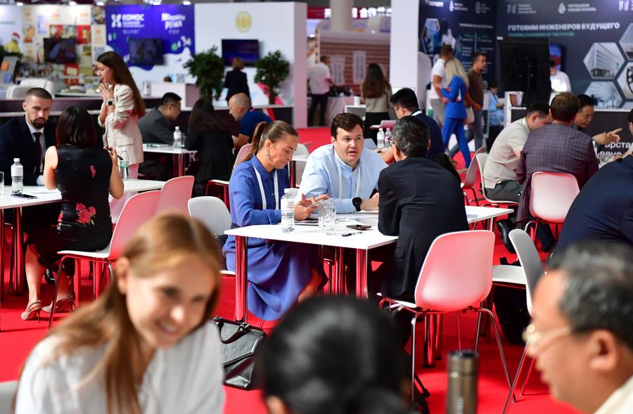 18 августа, Казань, Россия. Предприниматели из многих стран, прибывшие на 3-й международный форум "Ростки: Россия и Китай -- взаимовыгодное сотрудничество", ведут переговоры. /Фото: Синьхуа/